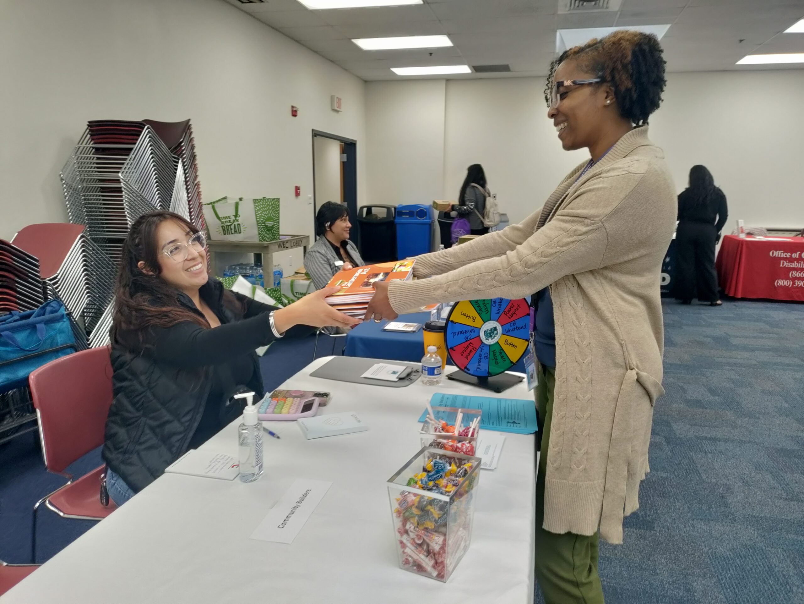 - Office of the Self-Determination Program Ombudsperson representative Jacqueline Davis giving Lanterman Consumer Guides to SDP service provider Community Builders.
